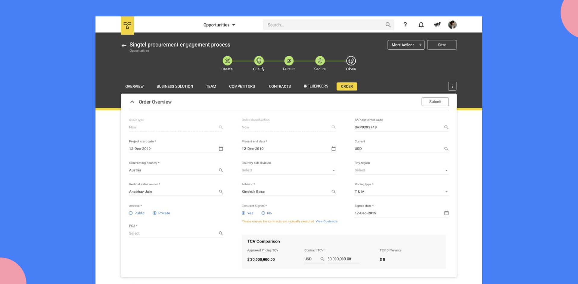 The process where a captured order gets translated into a project with a defined scope of work. Project teams are on-boarded, budgets are allocated, & delivery is kickstarted. Post the project deliverables, invoicing is done for revenue recognition.