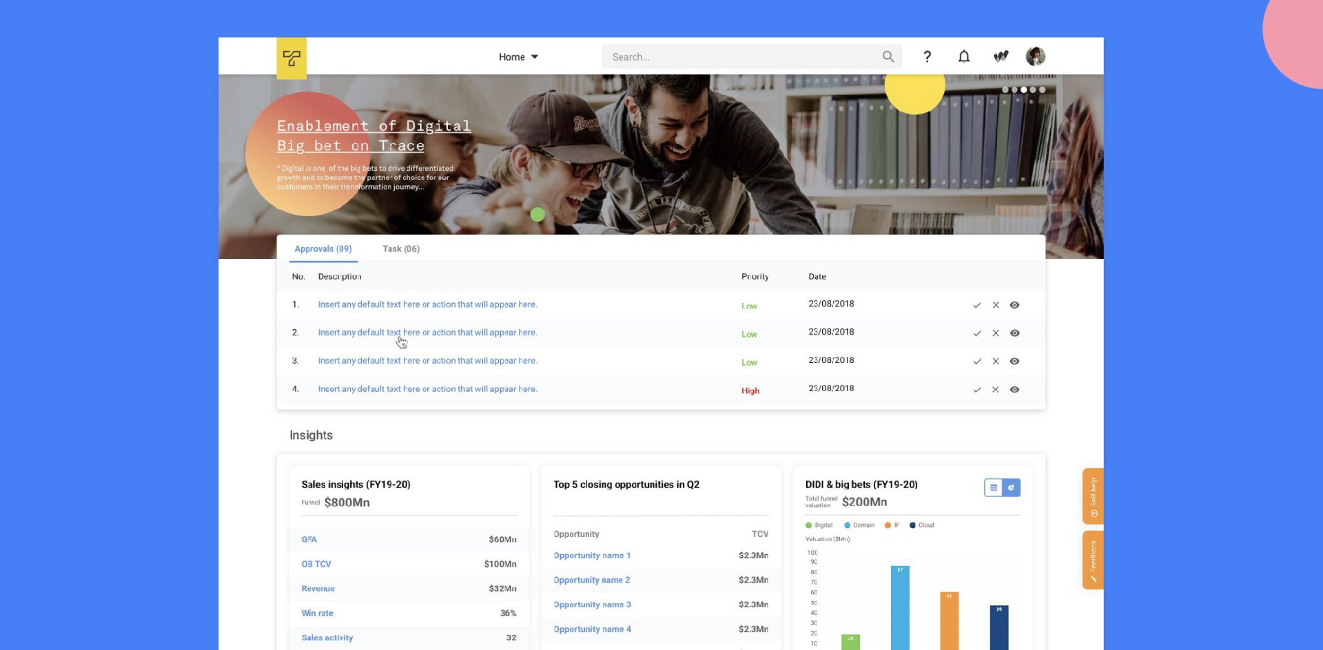 We used Use of data visualization components like dashboards, summary cards, calendars, etc., to give the user an accessible and contextual summary of information.